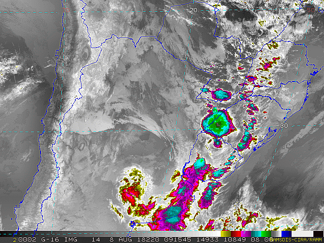 Observe a imagem de satélite desse início de manhã nebulosidade sobre o interior de Santa Catarina. A massa de ar polar já está em todo o estado com temperaturas menores que 8°C, com exceção do litoral onde as temperaturas estão entre 10 e 13°C. A mínima em Camboriú foi de 11,1°C e em Itajaí foi de 11,8°C. Rajadas fortes de vento desde ontem por causa de um ciclone extratropical com seu núcleo sobre o oceano na altura do Rio Grande do Sul. Em Mostardas no estado gaúcho tivemos rajadas próximas a 80 km/h. Aqui em Itajaí, rajadas de 49 km/h às 6 horas.