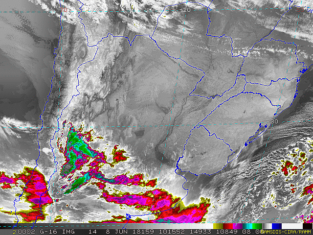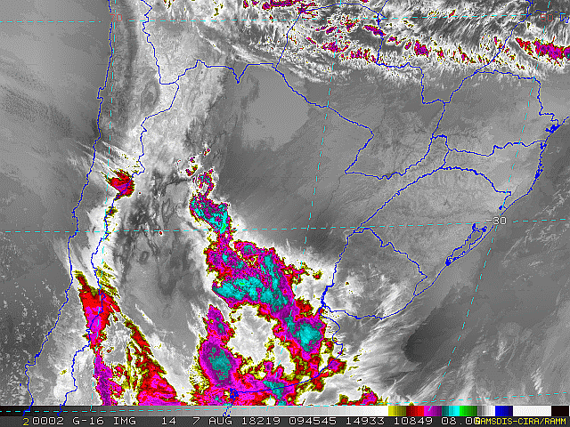 Observe a imagem de satélite desse início de manhã nebulosidade sobre o interior de Santa Catarina. A massa de ar polar já está em todo o estado com temperaturas menores que 8°C, com exceção do litoral onde as temperaturas estão entre 10 e 13°C. A mínima em Camboriú foi de 11,1°C e em Itajaí foi de 11,8°C. Rajadas fortes de vento desde ontem por causa de um ciclone extratropical com seu núcleo sobre o oceano na altura do Rio Grande do Sul. Em Mostardas no estado gaúcho tivemos rajadas próximas a 80 km/h. Aqui em Itajaí, rajadas de 49 km/h às 6 horas.