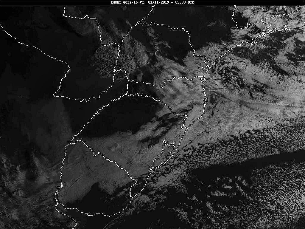 Hoje temos de um lado circulação marítima, e de outro áreas de instabilidade avançando pelo interior. No sábado uma nova frente fria se deslocará em direção ao estado, passando entre a noite de sábado e o domingo pela nossa região. Essas condições trazem pancadas de chuva para hoje e sábado, e chuva para o domingo. Observe a imagem de satélite desse início de dia nebulosidade concentrada entre o planalto e o litoral.