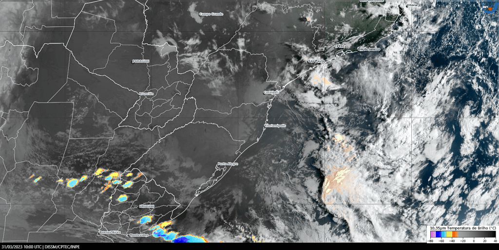 Imagem do satélite GOES 16/NOAA/EUA – Canal True-Color + IR 10,35 µm – dia – 31/03/2023 – Hora local: 07:00 – Sul do Brasil. Fonte: Instituto Nacional de Pesquisas Espaciais (INPE)/Centro de Previsão de Tempo e Estudos Climáticos (CPTEC)/Divisão de Satélites e Sistemas Ambientais (DAS) modificado por LabClima/UNIVALI. Clique para ampliar.