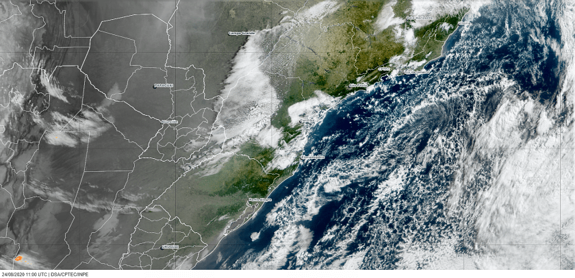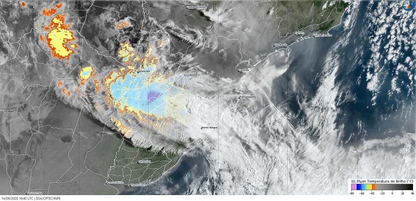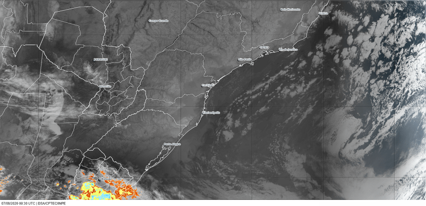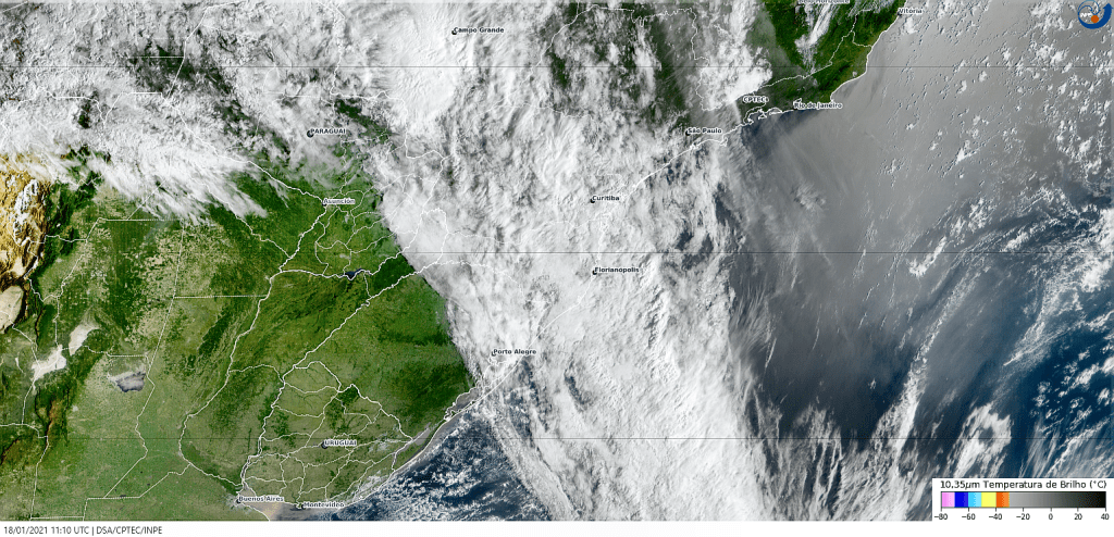 Imagem do satélite GOES 16/NOAA/EUA – Canal True-Color + IR 10,35 µm – dia – 12/10/2021 – Hora local: 20:00 – Sul do Brasil. Fonte: Instituto Nacional de Pesquisas Espaciais (INPE)/Centro de Previsão de Tempo e Estudos Climáticos (CPTEC)/Divisão de Satélites e Sistemas Ambientais (DAS) modificado por LabClima/UNIVALI. Clique para ampliar.