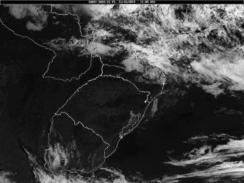 Imagem do satélite GOES 16/NOAA/EUA – Canal do Visível – dia 11/12/2019 – Hora local: 08:00 – Sul do Brasil. Fonte: Instituto Nacional de Meteorologia (INMET) modificado por LabClima/UNIVALI.