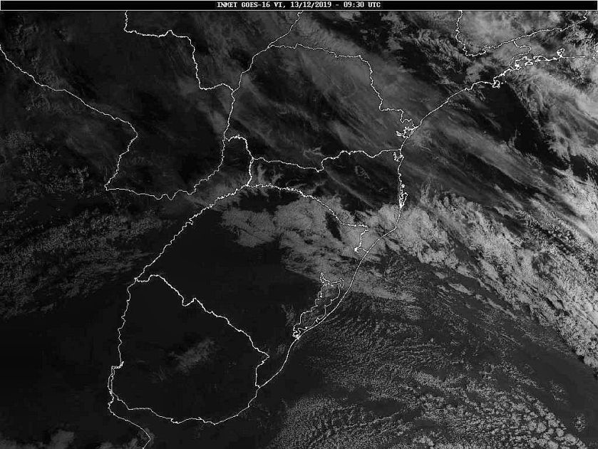 Imagem do satélite GOES 16/NOAA/EUA – Canal do Visível – dia 13/12/2019 – Hora local: 06:30 – Sul do Brasil. Fonte: Instituto Nacional de Meteorologia (INMET) modificado por LabClima/UNIVALI.