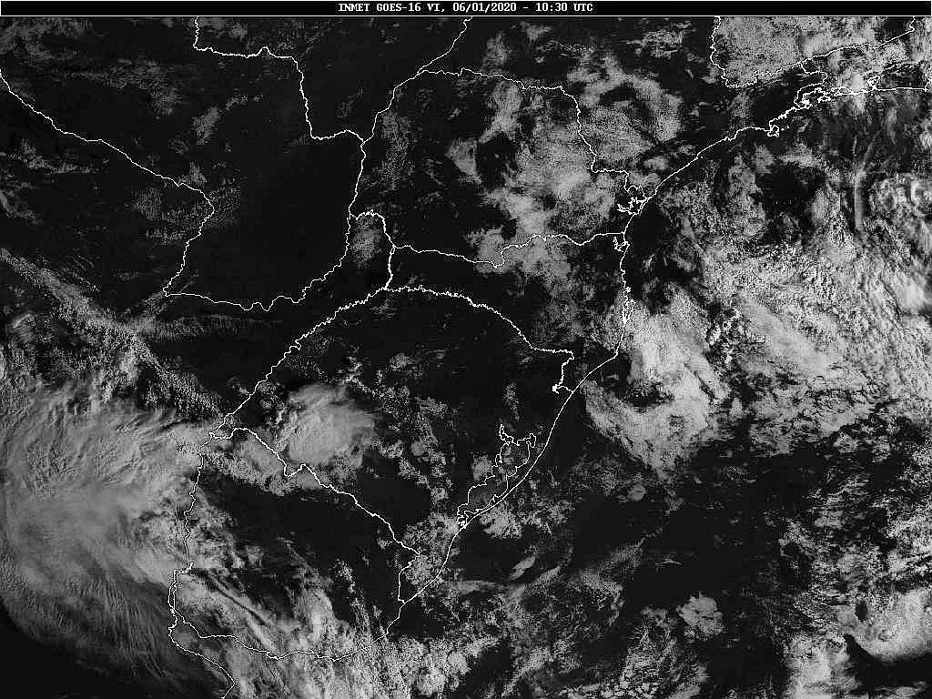 Imagem do satélite GOES 16/NOAA/EUA – Canal do Visível – dia 06/01/2020 – Hora local: 07:30 – Sul do Brasil. Fonte: Instituto Nacional de Meteorologia (INMET) modificado por LabClima/UNIVALI.