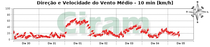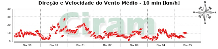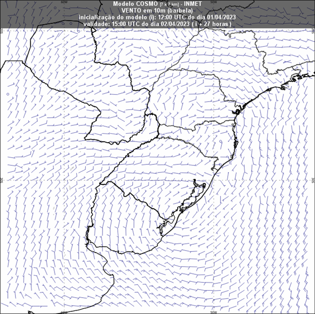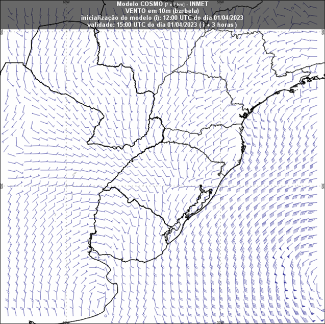 Figura 2 – Modelo de vento 10 m – 01/04/2023 – 12 h local. Fonte: INMET (Instituto Nacional de Meteorologia).
