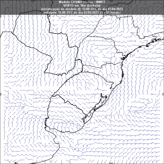 Figura 4 – Modelo de vento 10 m – 03/04/2023 – 12 h local. Fonte: INMET (Instituto Nacional de Meteorologia).