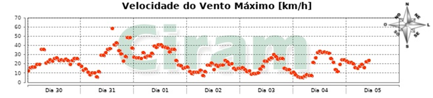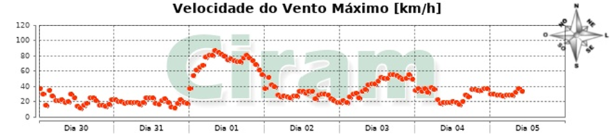 As figuras 5 e 6 trazem a direção e intensidade do vento das estações meteorológicas do INMET das cidades de Rio Grande (RS) e Laguna (SC). Observe a direção e intensidade do vento nos dias 1, 2 e 3. No dia 1 tivemos rajadas de vento de 40 km/h em Rio Grande e 80 km/h em Laguna. Já o vento médio era de 20 km/h em Rio Grande e 60 km/h Laguna. No dia 3, o vento médio era da direção de nordeste e mais fraco. Ontem, dia 4, o vento mudou para direção sul, e hoje para sudeste, se mantendo, facilitando a navegação dos barcos mais atrasados, que chegaram hoje pela manhã.