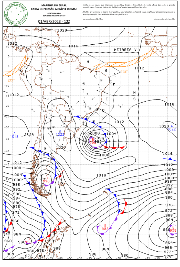 Figura 1 – Carta sinótica de 01/04/2023 (12Z). Fonte: Marinha do Brasil